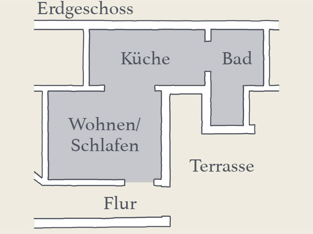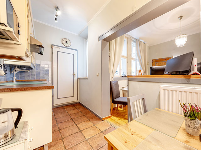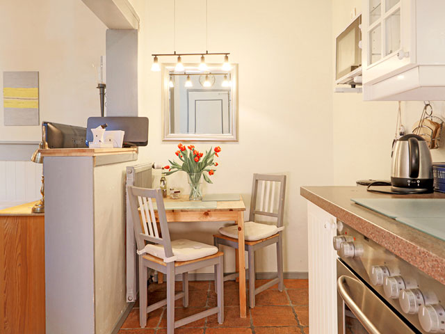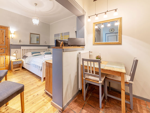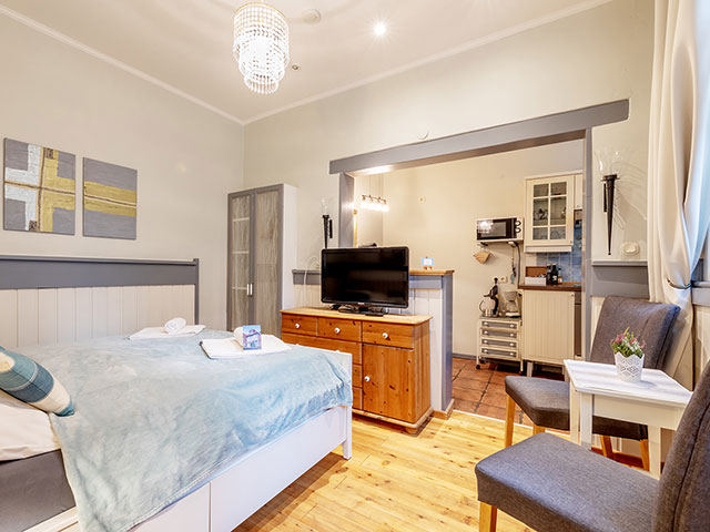 Diese Ferienwohnung befindet sich im Erdgeschoss im hinteren Bereich des Hauses mit Blick auf den Innenhof. Das Studio ist ca. 20qm groß und eignet sich für 1-2 Personen.